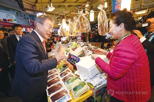 문재인 대통령이 전국투어 두 번째 일정으로 8일 오후 경북 포항 죽도시장을 방문, 지역상품권으로 과메기를 구입하고 있다.