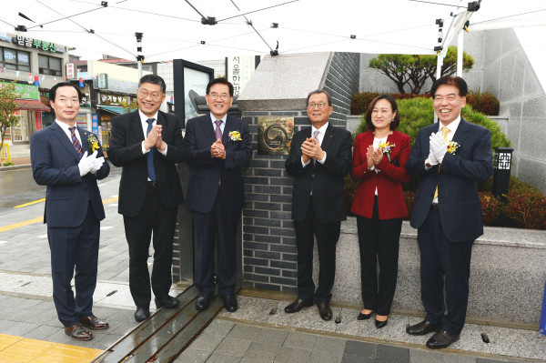 8일 서울한방진흥센터에서 ‘2018 대한민국 국토대전’ 대통령상 수상 기념 동판 제막식이 개최됐다. 기념 동판은 정문 입구에 가로·세로 30cm 크기로 설치됐다. 사진은 동판 제막식에 참가한 유덕열 구청장(왼쪽 세번째), 강현수 국토연구원장(왼쪽 두번째), 관계자들이 기념사진을 촬영하고 있는 모습. (사진제공=동대문구청)