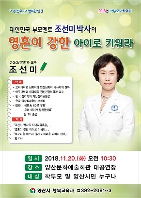 양산시 학부모아카데미는 자녀교육에 대한 정보 제공과 학부모의 교양 함양을 위해 교육 전문가를 초빙하여 강의형식으로 진행되며, 이번 학부모아카데미는 대한민국 부모멘토인 조선미 박사를 초청해 ‘영혼이 강한 아이로 키워라’라는 주제로 아이의 자존감을 높이면서도 아이의 영혼이 성장하는데 도움을 주는 교육에 대해 강의할 예정이다.