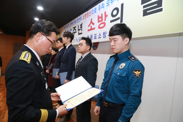 서울 영등포소방서는 최근 본서 4층 강당에서 내근직원들과 의용소방대원 및 소방관계자 등이 참석한 가운데 '제56주년 소방의 날 기념식'을 진행했다. 사진은 서순탁 서장이 우수한 소방대원에게 표창장을 수여하는 모습. (사진제공=영등포소방서)
