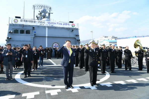 시는 나라사랑 정신을 기린다는 취지에서 지난 5일 자매결연 함정인 광개토대왕함을 방문해 ‘배틀 플래그 교환식’을 진행했다.