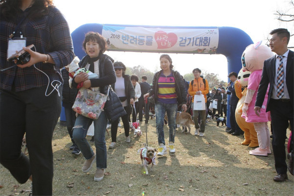 서울 강동구는 지난 10일 일자산 잔디광장에서 ‘2018 반려동물 사랑나눔 걷기대회를 열었다. 걷기대회는 2015년부터 매년 개최돼, 성숙한 반려문화를 만들어가는 대표적인 반려동물 문화축제로 자리 잡았다. 사진은 주민들이 반려동물과 함께 걷고 있는 모습. (사진제공=강동구청)