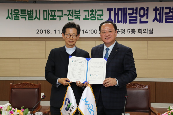 지난 9일 전북 고창군청 대회의실에서 서울 마포구와 고창군의 자매결연 체결식이 열렸다. 체결식은 유동균 구청장, 유기상 고창군수, 조규철 고창군의회 의장, 양 도시의 간부공무원 등이 참석한 가운데 참석인사 소개, 홍보동영상 상영, 경과보고 등으로 진행됐다. 사진은 유 구청장(오른쪽)과 유 군수가 기념촬영을 하는 모습. (사진제공=마포구청)