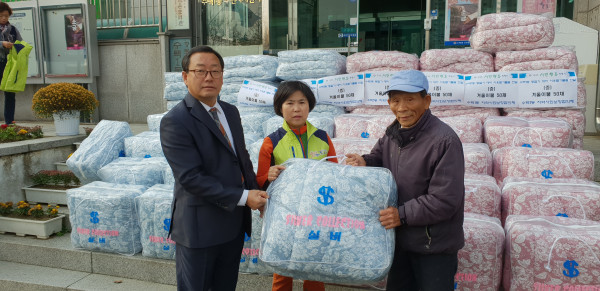 경기 구리시 수택1동 지역사회보장협의체는 최근 동절기를 맞아 지역내 저소득층 홀몸노인 및 저소득 중장년층 단독 가구를 위한 이웃돕기 물품 전달식을 진행해 겨울 이불 50채를 전달했다. 사진은 지역내 홀몸노인에 이불을 전달하는 모습. (사진제공=구리시청)