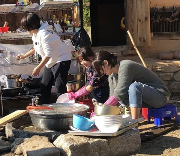 사진 속에는 강경헌이 '불타는 청춘' 멤버 이연수, 송은이와 함께 설거지를 하는 모습이 담겨 있다. 특히 빨간 고무장갑을 끼고 즐거워하는 이연수가 시선을 끈다.