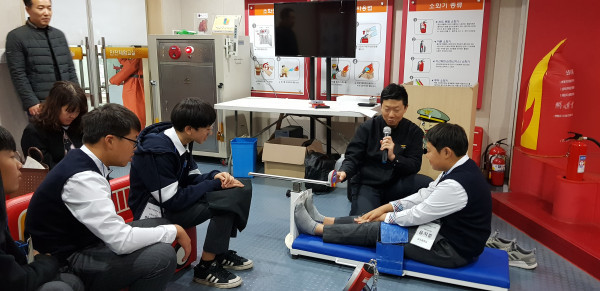 서울 동작소방서는 12일 오전 상도중학교 학생 10명을 대상으로 소방서 3층 소방안전체험교실에서 미래 소방관 직업체험 프로그램을 운영했다. 사진은 학생들이 소방공무원 체력검정 테스트를 체험해 보고 있는 모습. (사진제공=동작소방서)