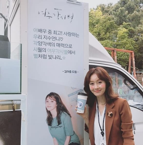김지수는 최근 자신의 인스타그램계정에 "매일 이어지는 촬영으로 지쳐가고 있을때 도착한 아중이가 보내준 커피차!~ 응원 문구가 시처럼 너무 좋아 더 감동받았어요.