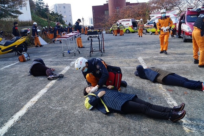한편, 이 날 훈련은 남부소방서가 주관하여 남구청, 남구보건소, 남부경찰서 등 10개 기관에서 168여명이 참여하여, 교통사고로 인한 사상자 40명 이상의 대형인명피해가 발생하였다고 가정하여 사고현장 초기 수습활동, 초기 중증도 분류․응급처치, 환자 이송 등 체계적인 구급시스템 가동 능력을 강화하고 관계기관의 공조체계를 구축하는데 중점을 두고 진행했다.