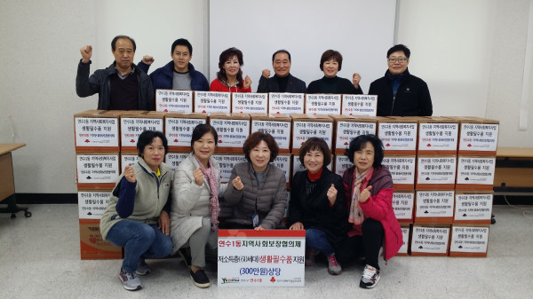 인천 연수구 연수1동 지역사회보장협의체는 최근 홀몸노인과 거동이 불편한 장애인, 저소득층 등 60가구에 생활필수품(300만원 상당)을 전달했다. 사진은 전달식에 참여한 관계자들이 기념촬영을 하는 모습. (사진제공=인천연수구청)