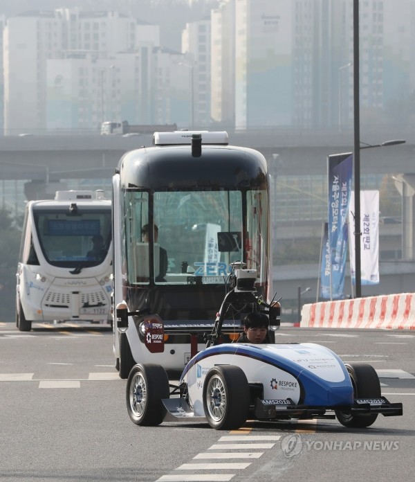 15일 오전 경기도 성남시 판교 제2테크노벨리 LH기업성장센터에서 열린 '제2회 판교 자율주행모터쇼'에서 인천대 자율주행 포뮬러와 경기도 '제로셔틀'(왼쪽 두 번째), 스프링클라우드 'NAVYA'(오른쪽 두 번째) 등 자율주행 차량들이 차례로 입장하고 있다.