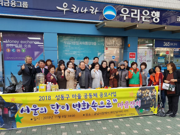 서울 성동구 금호4가동 주민들은 최근 구청에서 시행하는 마을공동체 공모사업의 일환으로 금남시장 공중화장실 입구에 '서울의 달이 벽화 속으로'라는 주제로 벽화를 조성했다. 사진은 벽화 조성 기념 마을잔치에서 기념촬영을 한 주민들 모습. (사진제공=성동구청)