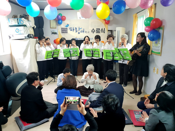 경기 하남시평생학습관은 16일 감일3통에서 파랑새학교 수료식을 개최했다. 파랑새학교는 한글, 셈, 알파벳, 스마트폰 활용 등의 내용으로 찾아가는 문해교실을 운영하는 사업이다. 사진은 파랑새학교 수료식이 진행되는 모습. (사진제공=하남시청)