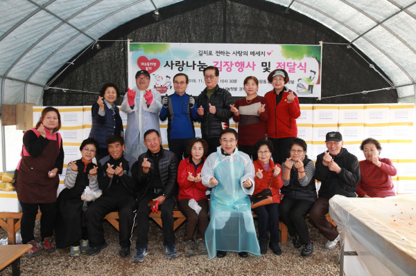 서울 도봉구는 최근 쌍문동 친환경 나눔텃밭(덕성여대 후문 앞)에서 ‘저소득 가정 돕기 사랑 나눔 김장 행사’를 진행했다. 사진은 행사에 참여한 이동진 구청장과 자원봉사자들이 기념촬영을 하는 모습. (사진제공=도봉구청)