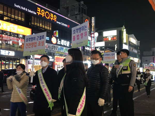 경기 수원시 팔달구는 지난 16일 인계동 중심상업지구와 나혜석거리에서 유해 환경으로부터 청소년을 보호하고 건전한 영업 풍토를 조성하고자 ‘불법호객행위 근절 합동 캠페인’을 실시했다. 사진은 참여자들이 캠페인을 진행하는 모습. (사진제공=수원시청)