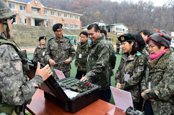 신상균 서울 양천구의장이 최근 경기도 시흥에 위치한 육군 제52사단 215연대 3대대 및 수도군단 방공대대에서 진행된 ‘동 통합방위협의회 부대초청행사’에 참석해 사격 및 화기 위력시범 등을 체험했다. 사진은 군 장비 물자에 대해 설명을 듣고 있는 신 의장(가운데)의 모습. (사진제공=양천구청)