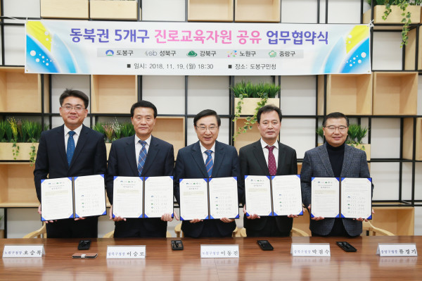 서울 도봉구는 19일 구민청에서 성북구·강북구·노원구·중랑구 동북 자치구 구청장들이 참석한 가운데 진로교육 인프라 구축을 위한 ‘동북5구 진로교육자원 공유 업무협약’을 체결했다. 사진은 구청장들이 협약을 기념해 기념촬영한 모습. (사진제공=도봉구청)