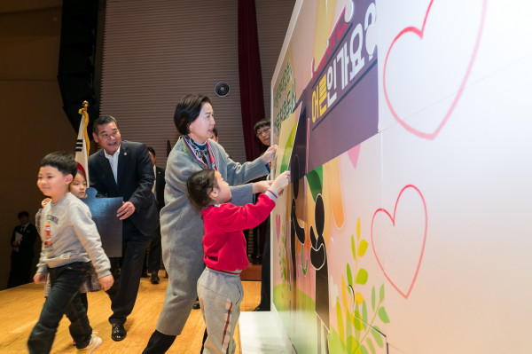 김수영 서울 양천구청장(오른쪽)이 19일 오후 양천구 해누리타운 해누리홀에서 열린 ‘아동학대 예방의 날 기념행사’에 참석해 아이들과 퍼즐 퍼포먼스를 하고 있다. (사진제공=양천구청)