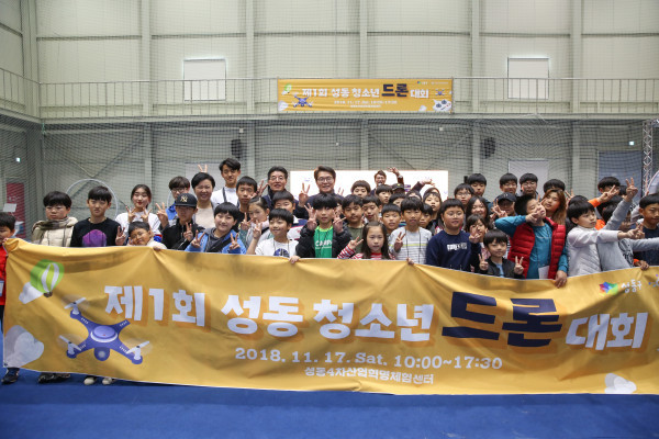 성동구는 최근 교육특구 지정 3주년 및 4차산업혁명 체험센터 개관 1주년을 기념하는 ‘성동 4차산업혁명 페스티벌’을 주민 약 1000명이 참석한 가운데 개최했다. 사진은 행사내 진행된 청소년 드론대회에서 참가자들이 기념촬영한 모습. (사진제공=성동구청)