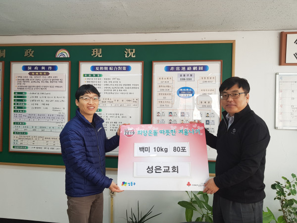 서울 성동구 왕십리제2동은 20일 구가 시행하는 ‘희망온돌 따뜻한 겨울나기 사업’의 일환으로 지역내 종교기관인 성은교회로부터 성품 백미(10kg) 80포를 후원받아 전달식을 진행했다. 사진은 동주민센터에서 진행된 전달식 모습. (사진제공=성동구청)