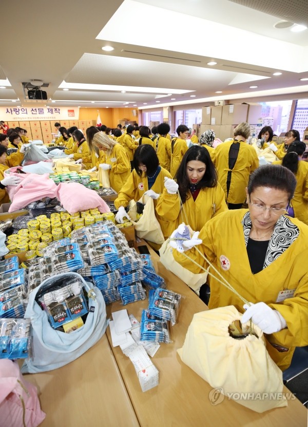 주한 외교대사 및 국무위원 부인들이 21일 오전 서울 중구 대한적십자사 서울사무소에서 연말 어려운 이웃을 돕기 위한 '사랑의 선물'을 제작하고 있다.