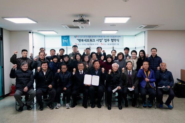 20일 서울 동대문구 용신동 주민센터와 한국공인중개사협회 서울북부지부 동대문구지회가 ‘행복네트워크 사업’ 업무협약을 맺고 '안전하고 행복한 마을 만들기'에 나선다. 사진은 업무협약 후 기념촬영을 하고 있는 관계자들의 모습. (사진제공=동대문구청)