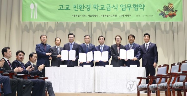 박원순 서울시장(오른쪽 네번째)이 21일 오전 서울시청에서 열린 서울시 고교 친환경 학교급식 업무협약에서 협약서에 서명한 뒤 자치단체장들과 기념촬영을 하고 있다.