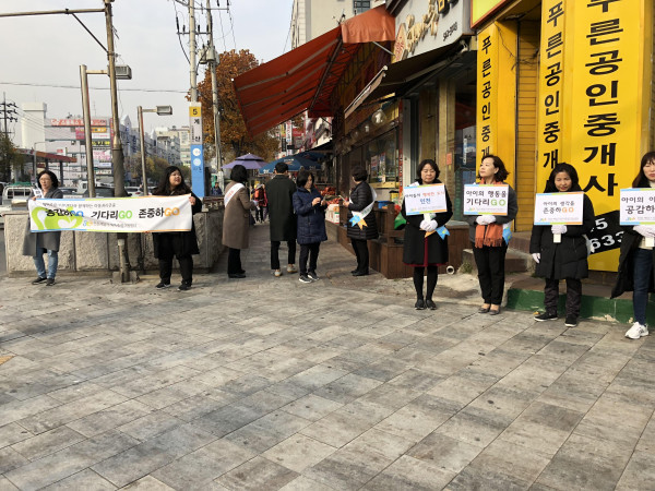 인천 계양구육아종합지원센터는 아동학대예방의 날인 지난 19일 지역내 어린이집 원장 및 영유아를 둔 부모 30여명과 함께 계산역사거리에서 아동학대예방을 위한 캠페인을 진행했다. 사진은 참여자들이 캠페인을 펼치는 모습. (사진제공=계양구청)