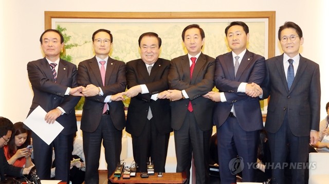 국회정상화에 합의한 문희상 국회 의장과 여야 원내대표들이 21일 국회의장실에서 합의문 발표에 앞서 사진촬영을 하고 있다. 왼쪽부터 민주평화당 장병완, 더불어민주당 홍영표 원내대표, 문 의장, 자유한국당 김성태, 바른미래당 김관영, 정의당 윤소하 원내대표.