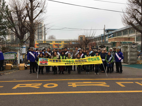 경기 동두천시는 21일 오전 사동 초등학교 앞에서 보행교통지킴이 회원, 공무원, 모범운전자회, 경찰 등 60여명이 참여한 가운데 보행교통지킴이 교통안전 캠페인 활동을 실시했다. 사진은 참여자들이 캠페인을 진행하는 모습. (사진제공=동두천시청)