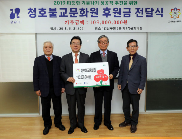 정순균 강남구청장(왼쪽에서 두 번째)이 21일 구청 제1작은회의실에서 청호불교문화원 이종욱 이사장으로부터 ‘2019 따뜻한 겨울나기’ 사업을 위한 후원금 1억800만원을 전달받았다. 사진은 정 구청장 및 관계자들이 기념촬영을 하고 있는 모습. (사진제공=강남구청)