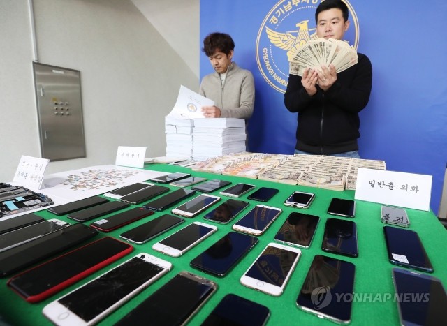 경기남부지방경찰청 광역수사대는 택시기사들로부터 분실 휴대전화 1천여 대를 사들여 중국으로 밀수출한 일당을 검거해 장물취득 등 혐의로 6명을 구속하고 14명을 불구속 입건하고 해외 운반책 수사 과정에서 8억6천만원 상당의 외화를 중국으로 밀반출하려 한 박모(52) 씨를 적발해 외국환거래법 위반 혐의로 형사입건하고 밀반출하려던 엔화와 홍콩달러 등을 압수했다고 22일 밝혔다. 사진은 분실 휴대전화와 외화 등 압수품.