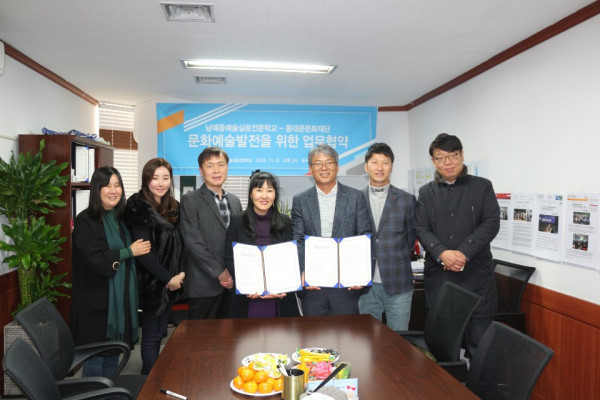 서울 동대문문화재단이 최근 남예종예술실용전문학교와 문화예술발전을 위한 업무협약을 체결하고, 창작 공간 공유, 홍보 협력 등을 통한 동대문구 문화브랜드의 가치 향상을 위해 박차를 가한다. 사진은 협약식 후 기념촬영을 하고 있는 관계자들의 모습. (사진제공=동대문구청)