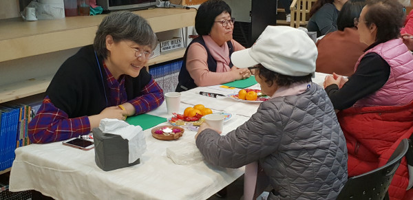 서울 성동구 행당제2동은 최근 해아림마을회관에서 행당대림 임대아파트 저소득 노인 16명을 초대해 치유활동가들이 지역 노인과 1대1로 대화하는 ‘어르신 공감’ 프로그램을 진행했다. 사진은 치유활동가가 프로그램에 참여한 노인과 대화하는 모습. (사진제공=성동구청)