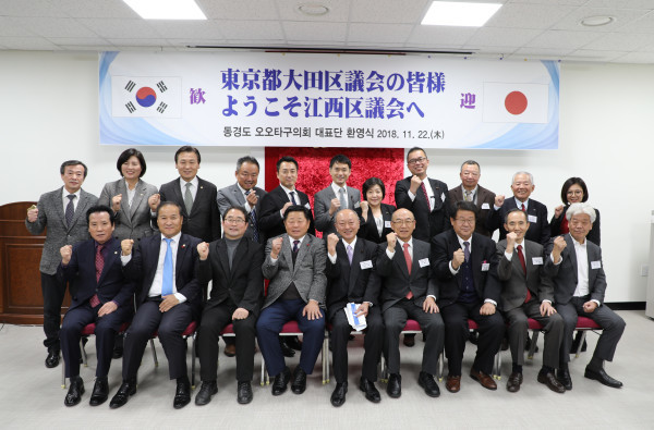 22일 일본 동경도(東京都) 오오타(大田)구의회 대표단이 자매결연에 앞서 양 기관의 우호 증진과 정보 교류를 위해 서울 강서구의회를 방문했다. 사진은 대표단 환영식에서 기념촬영을 하고 있는 강서구의원들과 오오타 구의회 대표단의 모습. (사진제공=강서구의회)