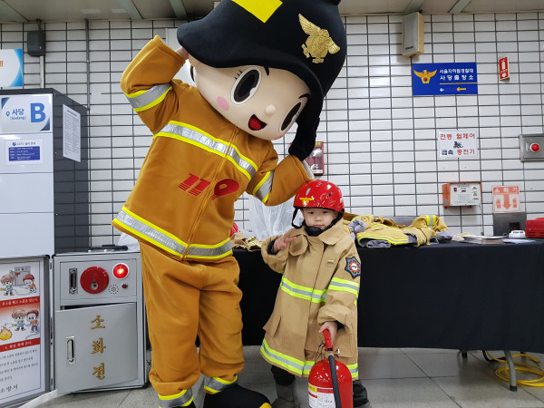 서울 동작소방서는 최근 불조심 강조의 달을 맞아 4호선 사당역 역사내에서 소방안전 작품 전시회, 소방안전체험교육, 주택용 소방시설 설치 홍보 등의 행사를 진행했다. 사진은 소방안전체험교육에 참여한 아동이 소방서 관계자와 기념촬영을 하는 모습. (사진제공=동작소방서)