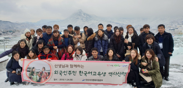 경기 안산시는 지난 24일 외국인주민 한국어 교육생을 대상으로 역사 산책을 진행했다. 이번 행사는 교육생들이 그동안 배운 한국 문화을 직접 체험해 봄으로써 보다 빠르고 안정적으로 사회에 적응할 수 있도록 마련됐다. 사진은 참여자들이 기념촬영을 하는 모습. (사진제공=안산시청)