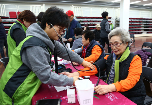 인천 미추홀구는 지난 24일 미추홀 노인복지관에서 취약계층을 위한 의료봉사를 연계 운영했다. 행사에는 인천의료원 사회봉사단 30여명이 참여, 취약계층 200여명을 대상으로 건강 상담 및 생활용품 등을 전달했다. 사진은 봉사단이 노인들의 혈압을 측정하고 있는 모습. (사진제공=미추홀구청)