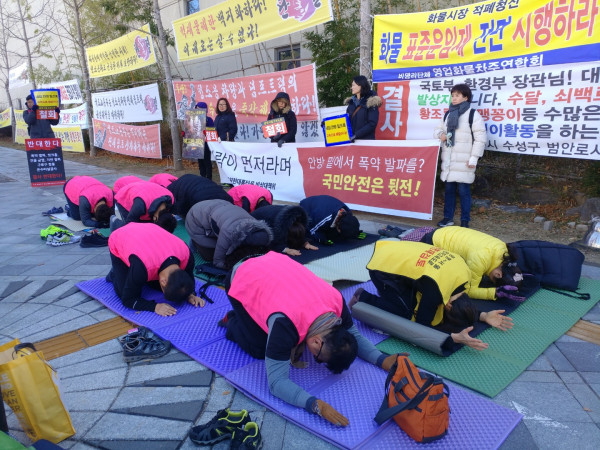 | ▲ 국토교통부 청사 앞에서 열린 '광명~서울 민자고속도로 실시계획 철회 촉구 시위'에서 주민들이 피켓을 들고 "철회 촉구"를 외치고 있다. (사진제공=구로구의회) | ||