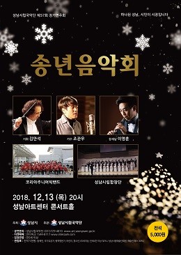 돌아오는 2018년 12월 13일 (목) 성남아트센터 콘서트홀 오후 8시부터 성남시립국악단 감독 겸 상임지휘자 김만석 지휘, 아나운서 권혜경 사회, 대중 인기가수 조관우, 성남시 홍보대사 코리아주니어빅밴드, 성남시립합창단, 장새납 협주곡 등 다채롭고 볼거리 풍성한 프로그램으로 송년음악회를 공연한다.