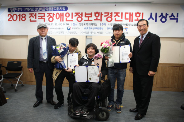 구로구가 최근 한국장애인정보화협회 주최로 고양시장애인정보화교육센터에서 열린 ‘2018 전국 장애인정보화 경진대회’에서 금상 2개, 동상 1개 등의 우수한 성적을 거뒀다. 사진은 수상자들이 기념촬영을 하는 모습. (사진제공=구로구청)