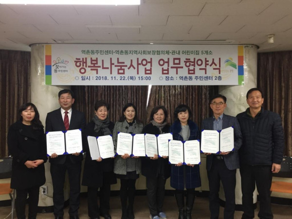 서울 은평구 역촌동 주민센터는 최근 동 지역사회보장협의체, 지역내 어린이집 5곳과 주민센터 2층 강좌실에서 지역내 저소득 및 취약계층의 복지체감도 향상을 위한 ‘행복나눔사업’ 업무협약을 체결했다. 사진은 관계자들이 기념촬영을 하는 모습. (사진제공=은평구청)