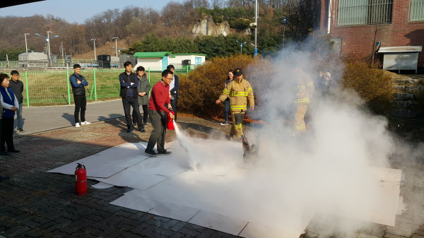 경기 김포시상하수도사업소는 26일 김포소방서(고촌119안전센터)와 함께 2018년 공공기관 합동 소방훈련을 실시했다. 사진은 참여자들이 소화기를 이용해 초기 화재진압 훈련을 하고 있는 모습. (사진제공=김포소방서)