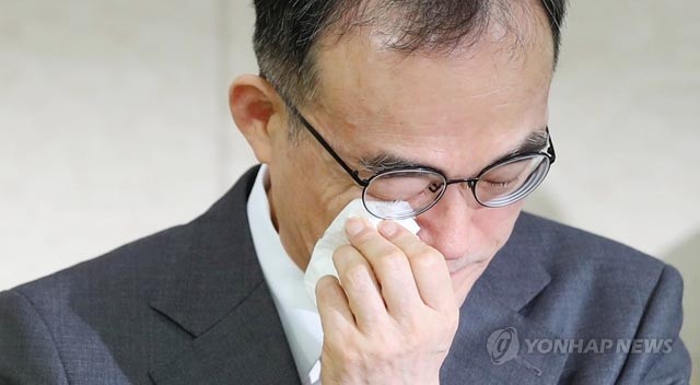 문무일 검찰총장이 27일 오후 서울 영등포구 여의도 이룸센터에서 형제복지원 피해자들과 만나 당시 검찰이 수사를 축소하고 은폐했다는 의혹에 대한 사과문을 읽던 중 눈물을 흘리고 있다.