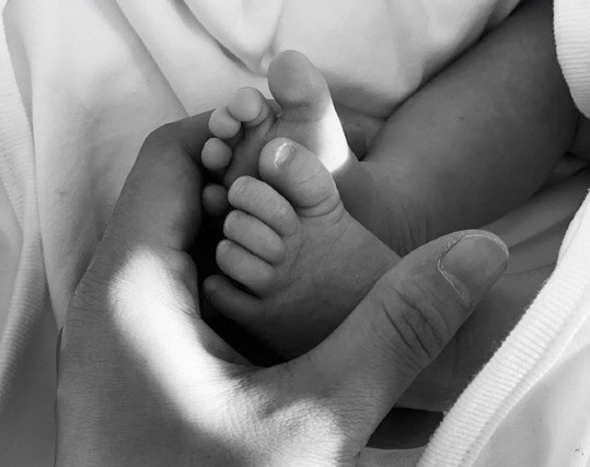 함께 공개한 사진에는 아이의 앙증맞은 발을 손으로 잡고 있는 모습이 담겨 있다.
