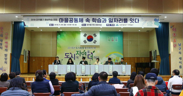 인천 미추홀구는 지난 26일 구청 대회의실에서 ‘평생학습 포럼’을 개최했다. ‘마을공동체 속 학습과 일자리를 잇다’라는 주제로 진행된 포럼에는 공무원과 주민 등 100여명이 참석했다. 사진은 참여자들이 토론하는 모습. (사진제공=미추홀구청)