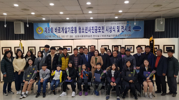 바르게살기운동 김포시협의회는 최근 김포시 평생학습관 전시실에서 ‘제6회 바르게살기운동 청소년사진공모전 시상식 및 전시회’를 개최했다. 사진은 수상자 및 관계자들이 기념촬영을 하는 모습. (사진제공=김포시청)