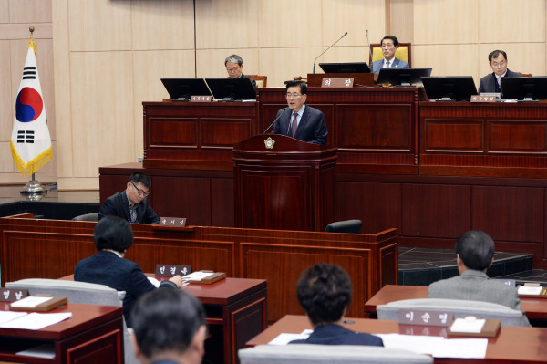 27일 유덕열 동대문구청장이 구의회 본회의장에서 ‘2019년도 구정 운영방향’을 제시했다. 사진은 2019년 중점 추진사업 및 예산에 대한 시정연설을 하고 있는 유 구청장의 모습. (사진제공=동대문구청)