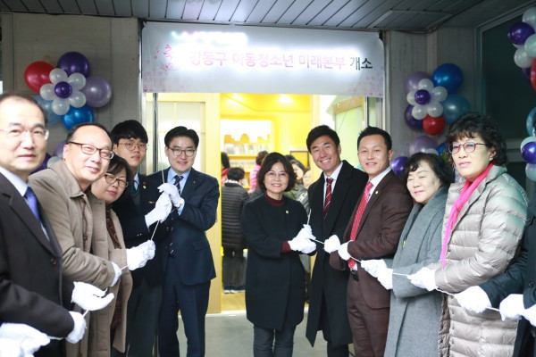 27일 강동구 성내1동 주민센터 별관 1층에서 어린이에게 여가활동을 지원하고 또래 간 교류 활성화를 목적으로 건립된 ‘강동구 아동ㆍ청소년 미래본부’ 개소식이 개최됐다. 사진은 개소식에 참가한 이정훈 구청장이 관계자들과 기념촬영을 하고 있는 모습. (사진제공=강동구청)