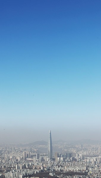 미세먼지 농도가 ‘나쁨’ 수준을 보인 28일 오전 경기도 광주시 남한산성에서 바라본 서울 시내가 파란 하늘 아래 미세먼지로 덮여 있다.