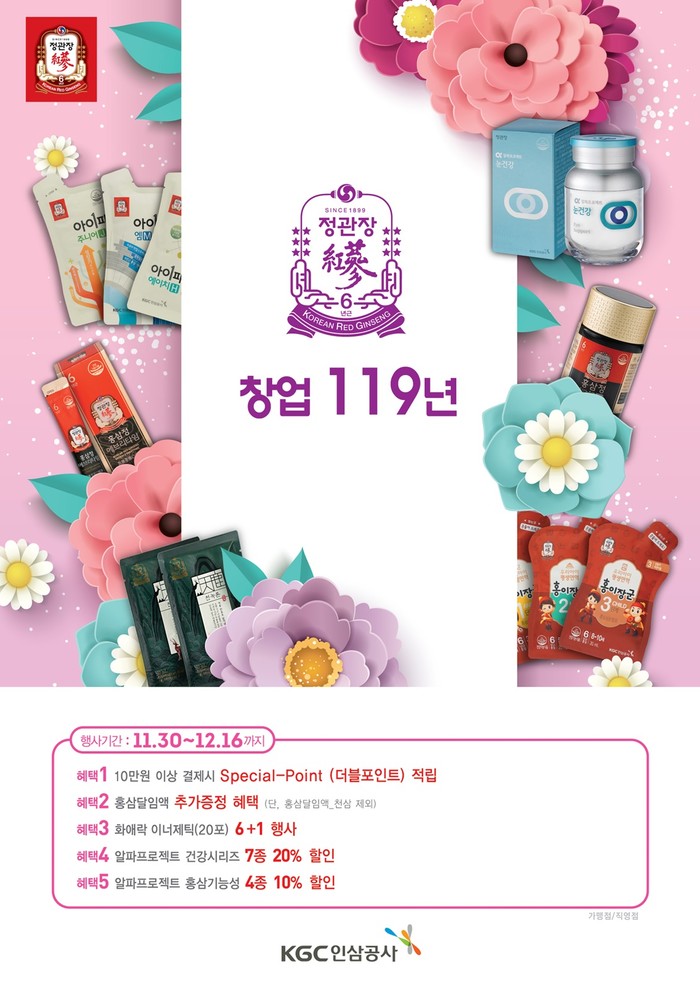 [시민일보=고수현 기자]KGC인삼공사가 119주년 창업기념일을 맞아 30일부터 오는 12월16일까지 총 17일간 프로모션을 전국 정관장 매장에서 진행한다.